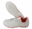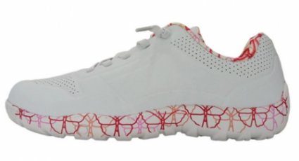 Bílá barva doplněná červeno-růžovým vzorem v oblasti podrážky a podšívky.